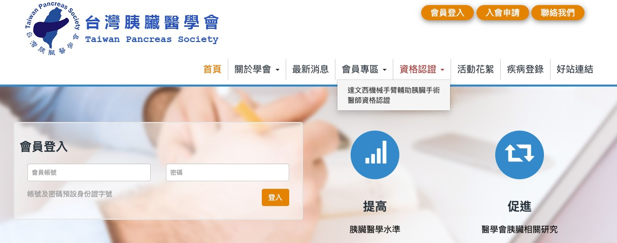 「達文西機械手臂輔助胰臟手術醫師資格認證」可以開始線上申請囉!申請位置: 首頁選單 > 資格認證 > 達文西機械手臂輔助胰臟手術醫師資格認證 (如下圖)或直接前往:https://twpancreas.org.tw/Davinci/apply